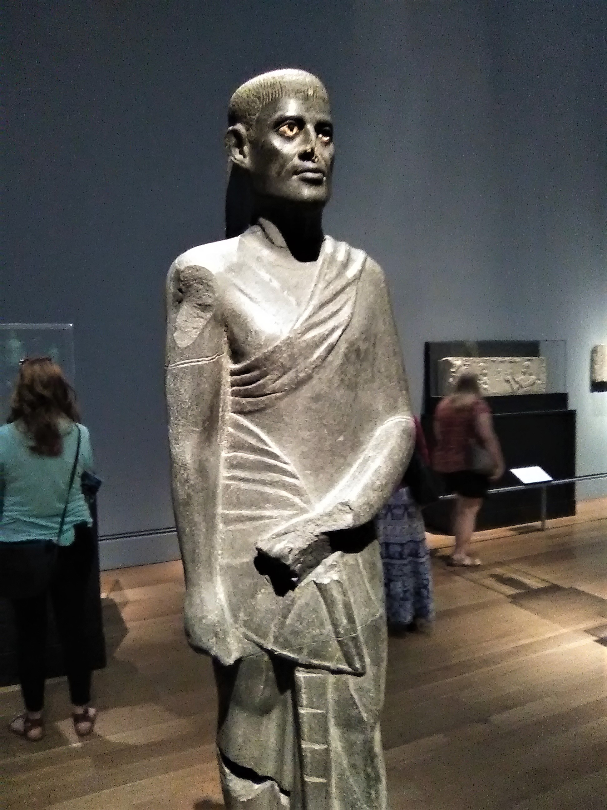 Statue of a Priest or Official; Ptolemaic or Romano-Egyptian, 50 BCE-50 CE; found in Soknopaiou Nesos in the Fayyum. This portrait is notable for its strong features, including prominent ears, a square jaw, and a firmly set mouth. The highly stylized hair is incised in short horizontal rows. This man wears a three-part garment with a fringed skirt and shawl and crosses his left arm over his torso. His attire and pose, as well as his youthful appearance, are common in portraits of priests and officials carved in the first century BCE and early first century CE.