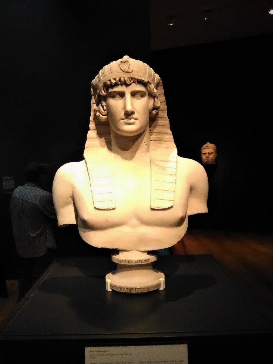 Bust of Antinous. Roman, 131-138 CE; found in Hadrian’s Villa, Tivoli, Italy. Antinous, the young companion of the emperor Hadrian (ruled 117-138 CE), drowned in the Nile in 130 CE and was posthumously honored with a cult that was celebrated throughout the Roman Empire. Hadrian’s Villa at Tivoli displayed numerous portraits of Antinous in the guise of a pharaoh or the underworld god Osiris, wearing a traditional nemes headdress with a uraeus (royal cobra).