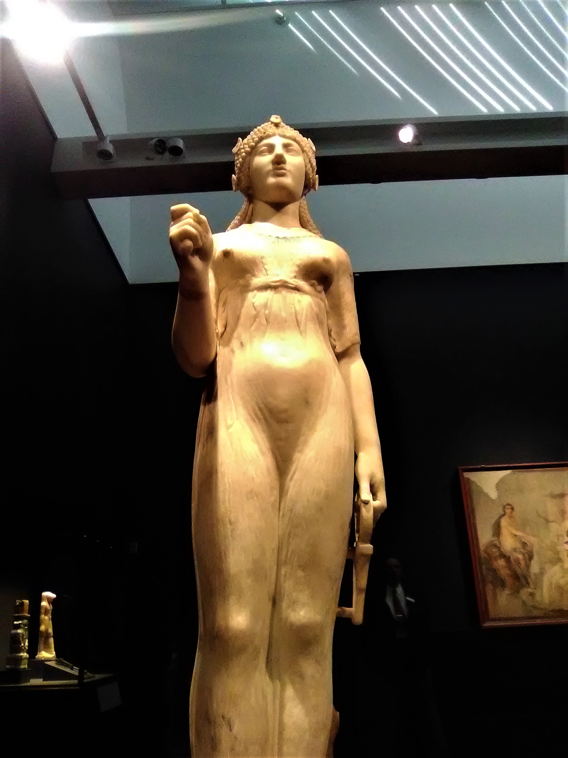 Statue of Isis. Roman, 1-79 CE; found in the Temple of Isis, Pompeii, Italy. Dedicated by a wealthy freedman named Lucius Caecilius Phoebus, this statue of the goddess Isis stood in the portico of her temple in Pompeii. The style of the sculpture is unusually eclectic. Isis wears a diaphanous dress belted below her breasts and carries her traditional attributes – an ankh (the hieroglyphic symbol for life) and a sistrum (Egyptian rattle, now missing). Her hairstyle and broad facial features, however, are borrowed from Archaic Greek models of about 500 BCE, perhaps an allusion to the antiquity of Egyptian religion.