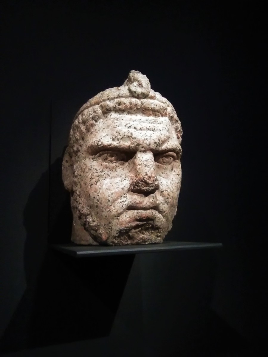 Head of Caracalla. Romano-Egyptian, 211-217 CE; found in Coptos, Egypt. The Roman emperor Caracalla (ruled 198-217) is shown wearing a uraeus (royal cobra) to mark his status as pharaoh. This head, carved from a hard Egyptian stone, once belonged to a colossal figure that stood in the Temple of Isis in Coptos, Egypt. It carefully copies the close-cropped hair, furrowed brow, and distinctive scowling expression of the ruler’s official portrait, which was first displayed in Rome in 211 CE and is known from many versions in marble.
