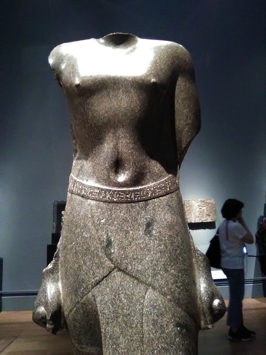 Torso of Harchebi (Archibios); Ptolemaic, 170-116 BCE. Harchebi was an Egyptian priest who served as dioiketes (finance minister) during the reign of Ptolemy VIII (170-116 BCE). He wears a traditional three-part kilt and holds both arms tightly at his sides, clenching rolls of cloth, a sign of status. The relief scene at the top of the inscribed back pillar shows him making offerings to the gods of Mendes, in the eastern Nile Delta: Harpokrates, the Ram of Mendes, and Hatmehyt. The hieroglyphic inscription on his belt provides his Egyptian name as well as its Greek form, Archibios. As a high official in the Ptolemaic administration, he used both names in performing his duties within a bilingual society.