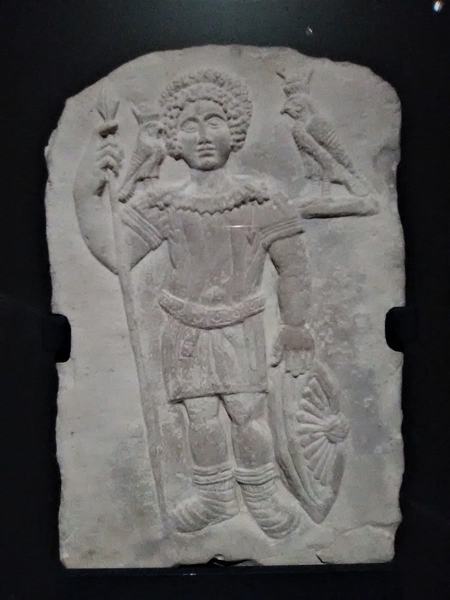 Gravestone of a Soldier. Romano-Egyptian, c. 300 CE. The deceased is shown in military garb, holding a spear and shield, with a wreath in his curly hair. Two falcons, each wearing the Double Crown of Upper and Lower Egypt, represent his devotion to the god Horus. The unnamed man was likely an Egyptian who served in the Roman army.