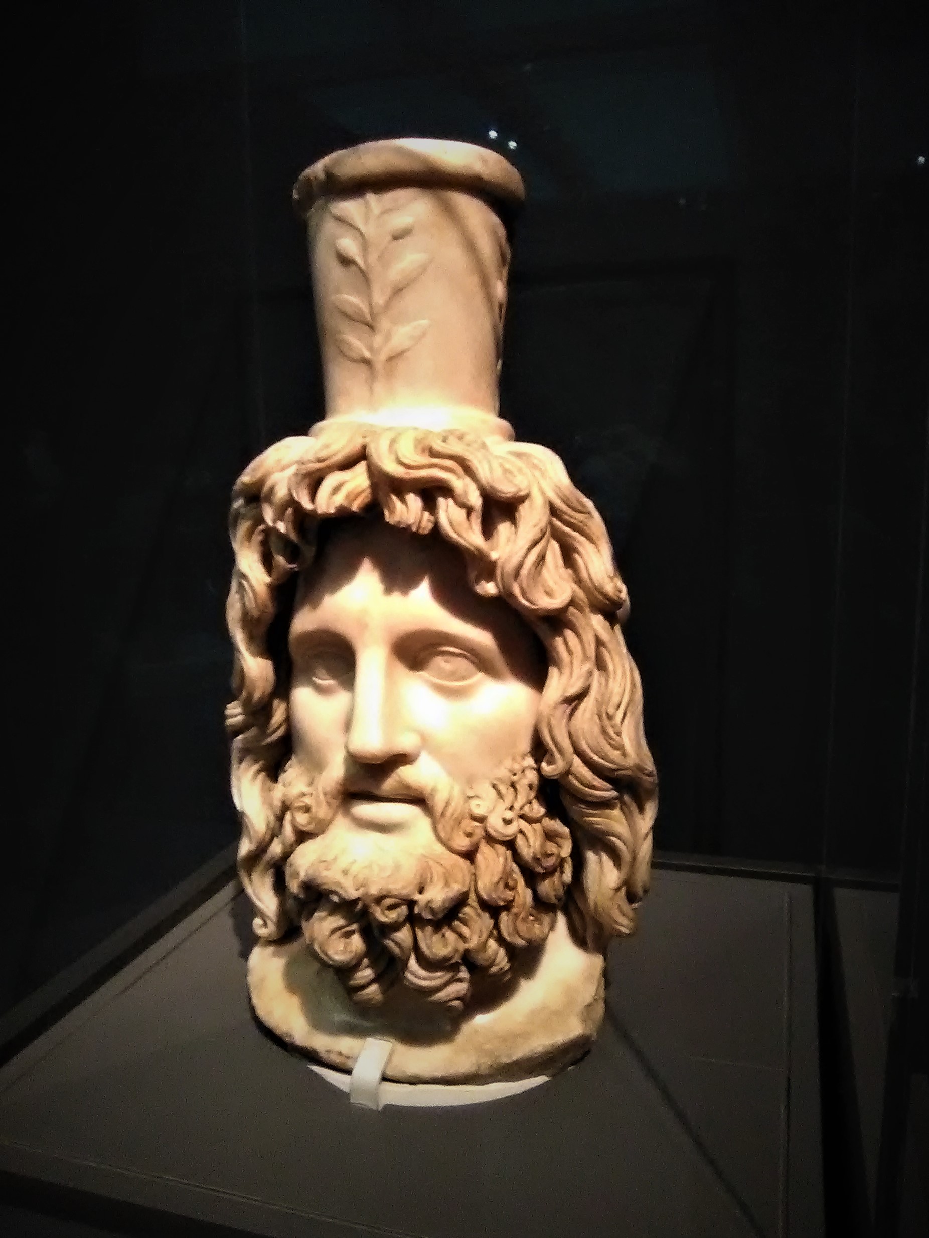 Head of Serapis. Roman, c. 200 CE; found in Walbrook, City of London. Worship of the god Serapis, the consort of Isis, spread from Egypt to the far reaches of the Roman Empire. This marble head was discovered in the Temple of Mithras in London in 1954. It may have been dedicated there when the Roman emperor Septimius Severus (ruled 193-211 CE) visited the city in 208 CE. The North African-born ruler particularly revered Serapis and styled his own portraiture on the deity’s appearance.